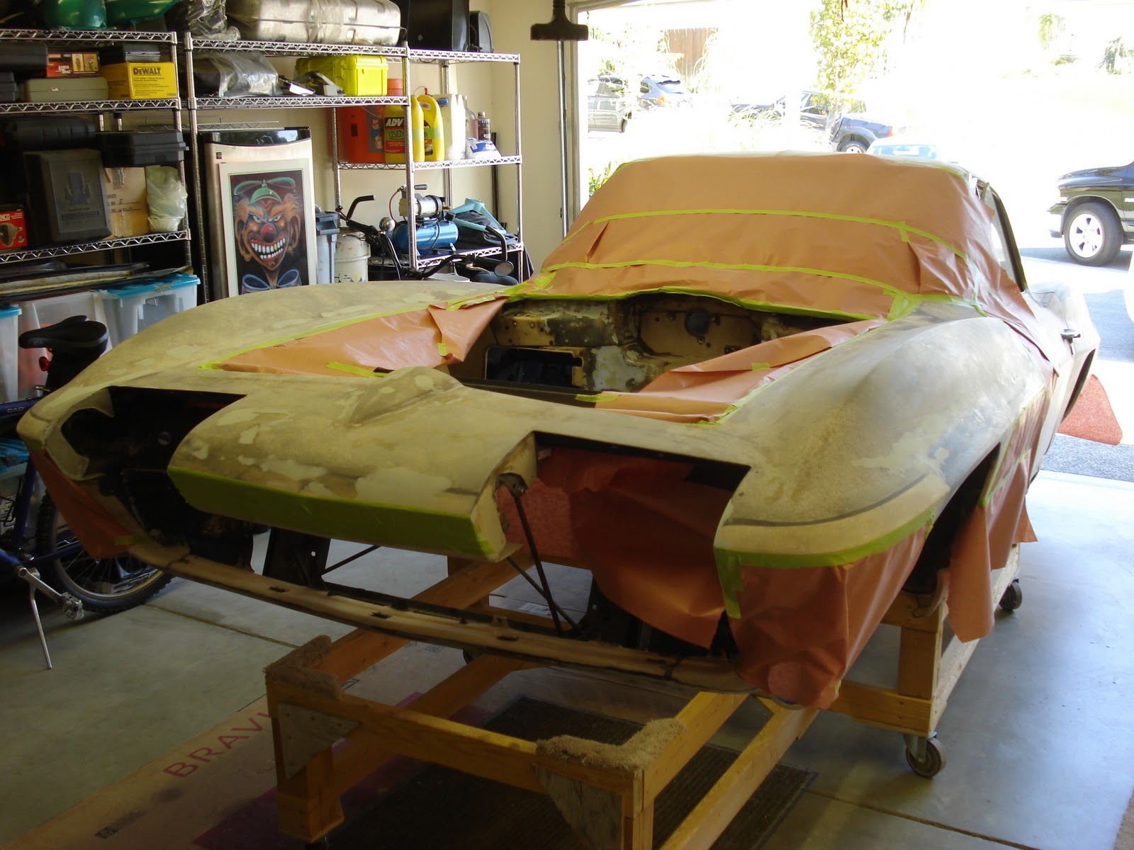 The weather cooperated for about 3 hours on Friday so we did some sandblasting. The body was wheeled to the RV pad and both of the driver side wheel wells were sandblasted.